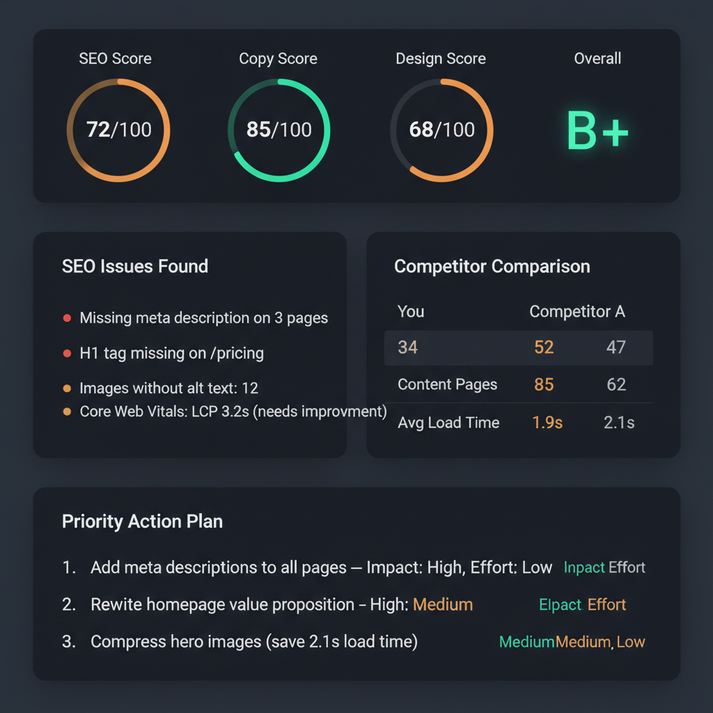 Enter any URL and get a full website audit — SEO, copy, competitors, design and a prioritized action plan. Results delivered to your inbox.
