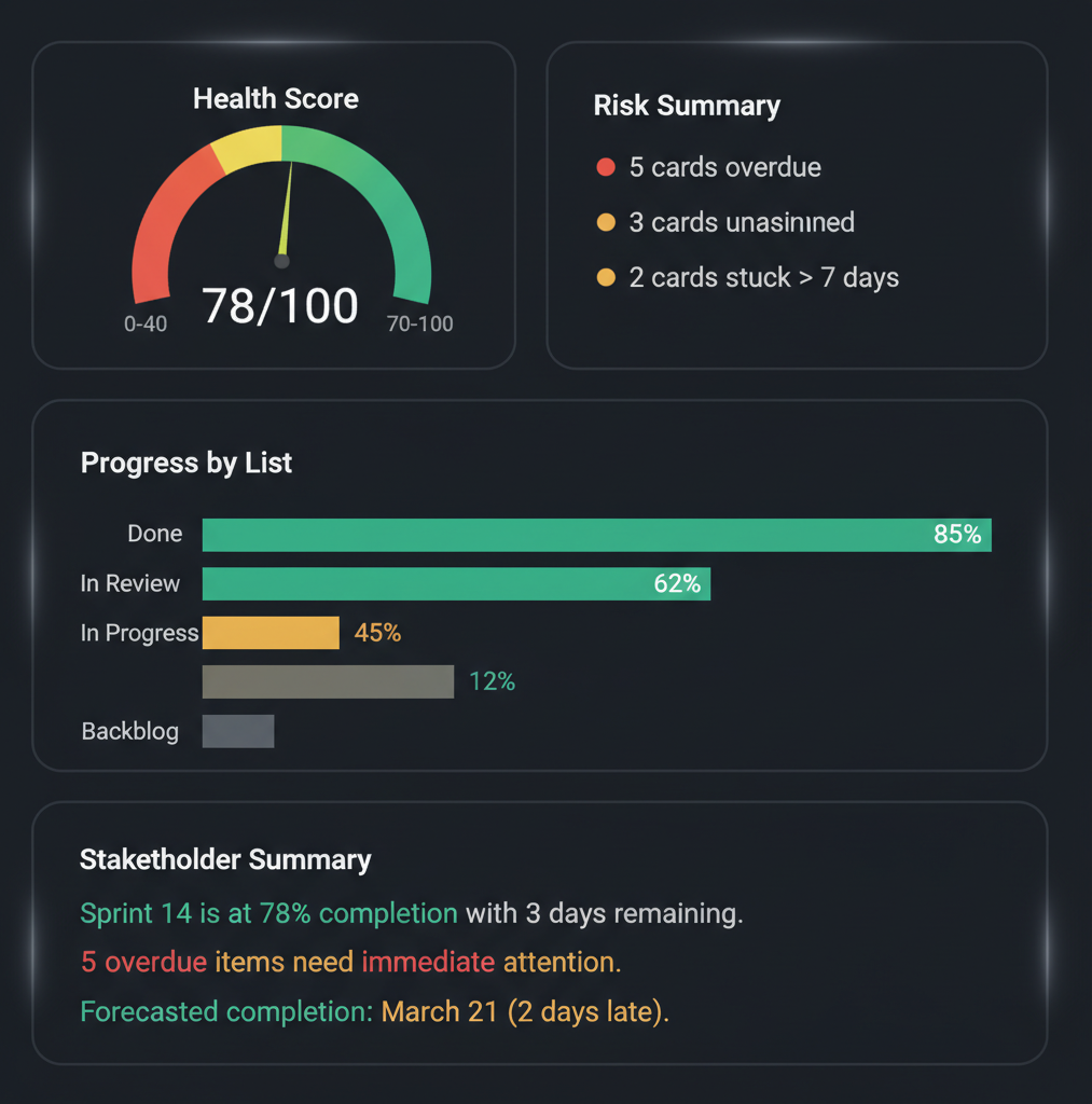 Missed deadlines nobody saw coming. Team members burning out silently because work piled up unevenly. Stakeholders asking for a status and you scrambling to compile one from memory. These are symptoms of the same problem: no objective view of your project. The Project Health Dashboard reads your Trello board and delivers the truth in under 60 seconds — a traffic-light health score, a risk radar with the top 5 issues, and a stakeholder-ready summary you can forward without editing.