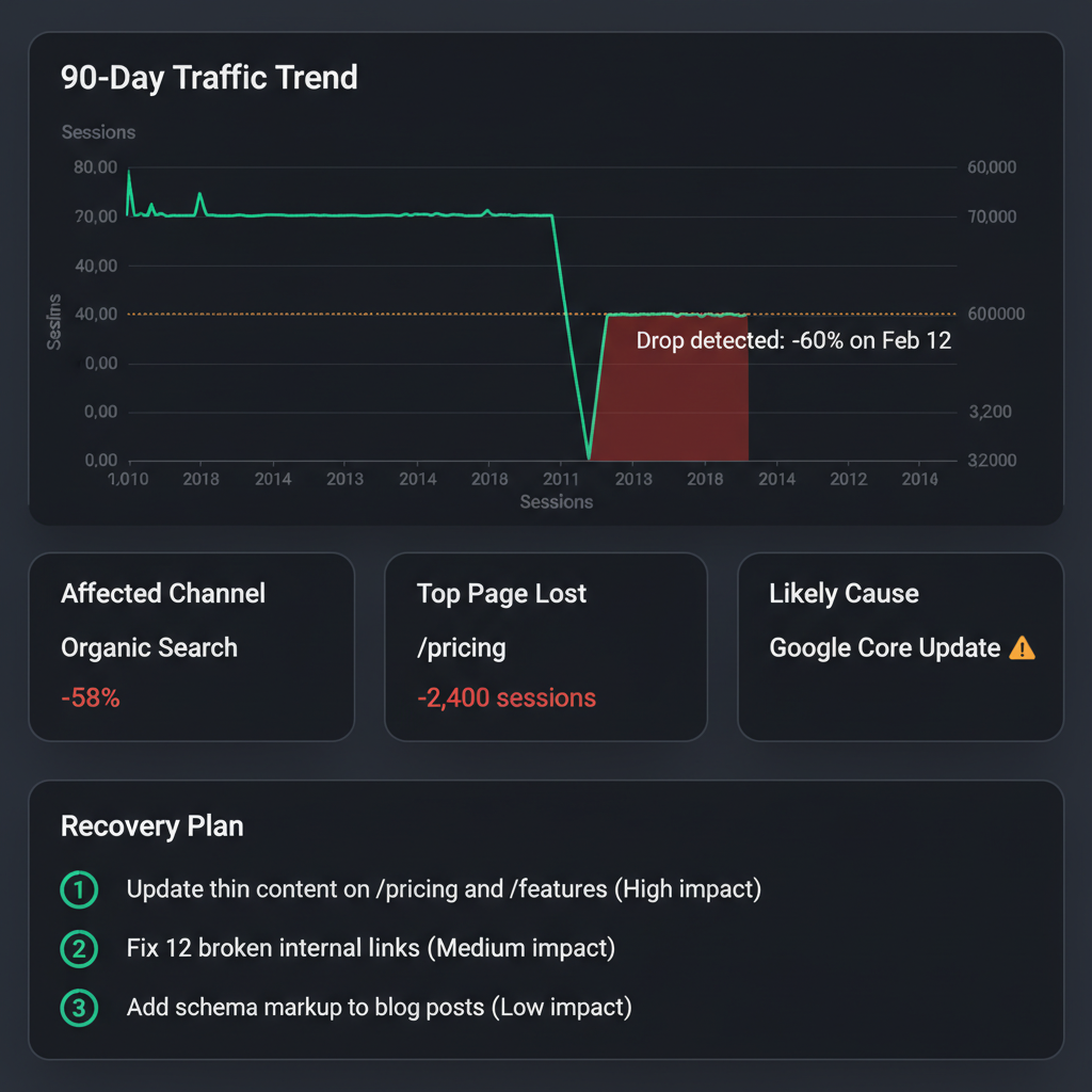 Every week your traffic stays down costs you leads, revenue and rankings that get harder to recover. Connect your Google Analytics and get the exact diagnosis — root causes identified, affected pages ranked by loss, and a recovery plan delivered to your inbox.