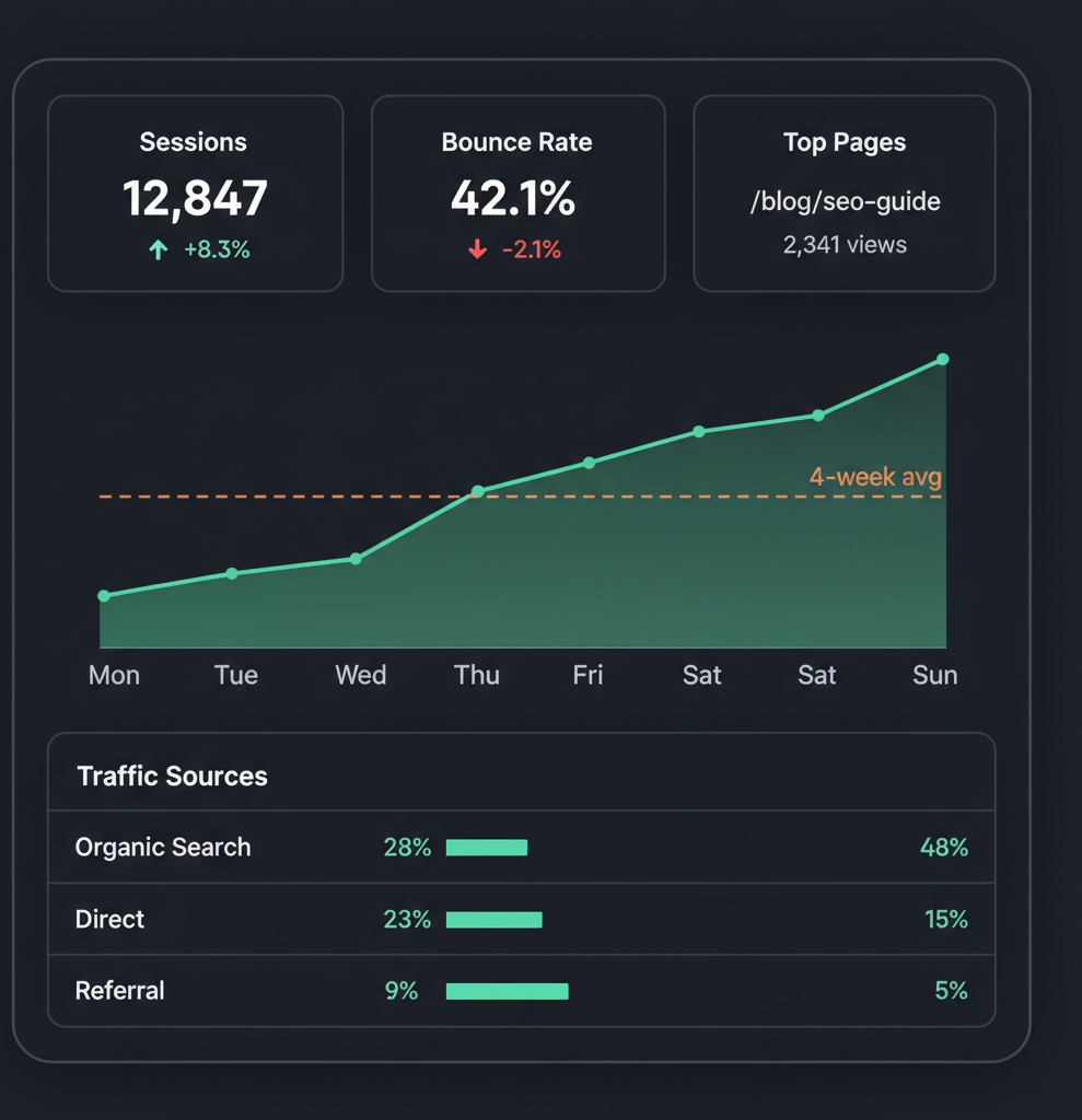 Pulls this week vs. last week: sessions, users, pageviews, top pages and traffic sources from your Google Analytics.